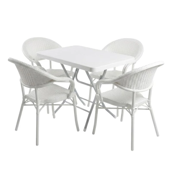A garnitúrához tartozó karosszékek a már korábban megismert 3D rattan mintázattal rendelkeznek, amely prémium megjelenést biztosít. Az ergonomikus kialakítású íves karfák és a háttámla hosszan tartó kényelmet nyújtanak. Minden elem kiváló minőségű, UV-stabil polipropilénből készült, így a garnitúra hosszú évekig megőrzi ragyogó fehér színét és szerkezeti integritását.