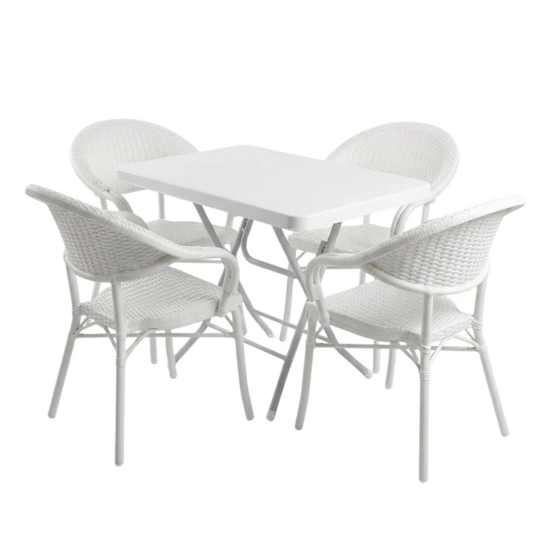 Teljes étkezőszett: Összehangolt megjelenésű asztal és székek a harmonikus kerti környezetért.