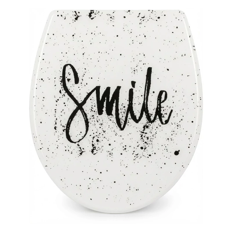 Az AquaSu WC-ülőke vidám „Smile” feliratával és finoman fröcskölt mintázatával barátságos, modern hangulatot visz a fürdőszobába. Letisztult fehér alapszíne és kézírás jellegű grafikai eleme egyszerre trendi és időtálló megjelenést biztosít, miközben a termék kényelmes és praktikus megoldást nyújt a mindennapi használat során.