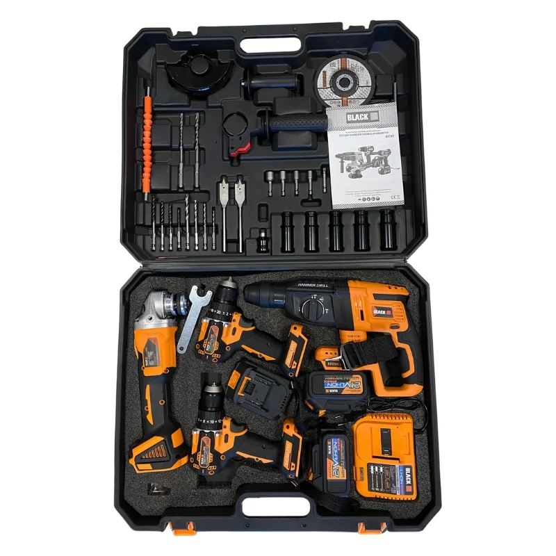 Ez a komplett BLACK akkumulátoros szerszámkészlet ideális választás otthoni barkácsoláshoz és profi felhasználáshoz is. A készlet négy különböző vezeték nélküli gépet tartalmaz, valamint számos kiegészítőt, fúrószárat és biteket, így minden fontos szerszám egyetlen praktikus hordtáskában található.