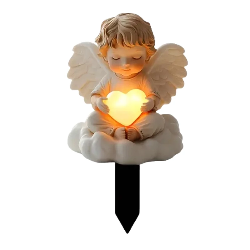 Ez a meghitt hangulatú, szív alakú fényt tartó angyal dísz méltó emléket állít szeretteinek. Időjárásálló anyagból készült, így egész évben használható a kertben, temetőben vagy emlékkertben. A lángmentes, szívformájú fényforrás biztonságos alternatívát kínál a gyertyákkal szemben, békét és örök emlékezést sugározva.