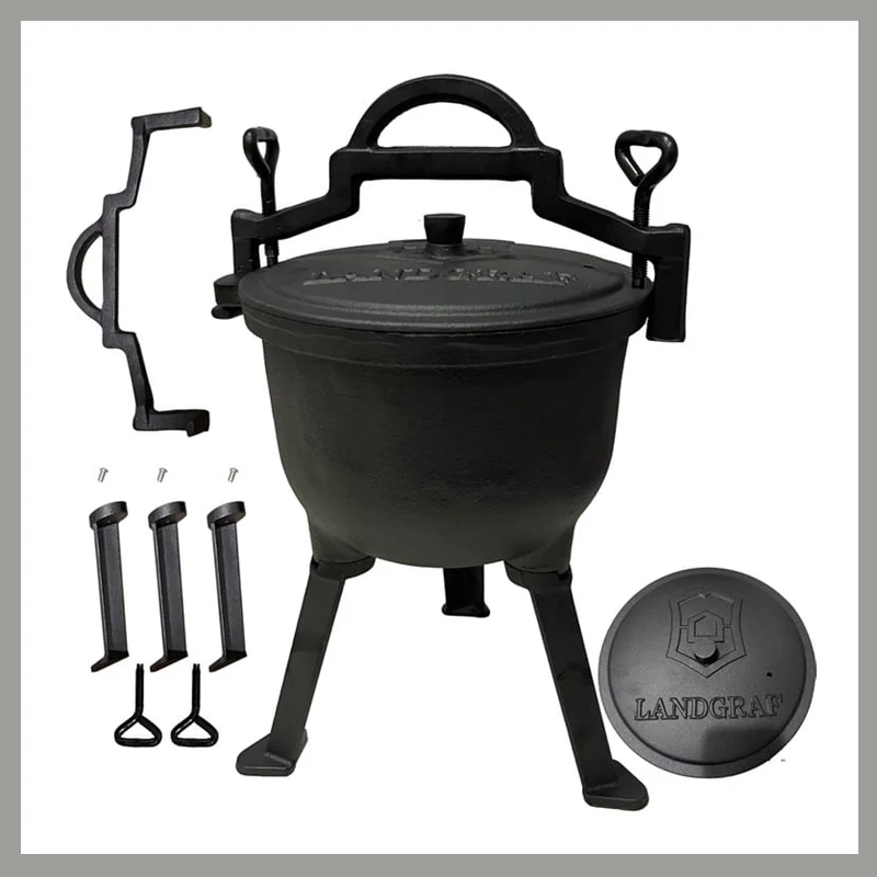 A képen látható termék egy öntöttvas bogrács, háromlábas állvánnyal és fedéllel, amelyet elsősorban szabadtéri főzéshez (pl. pörkölt, gulyás) használnak.