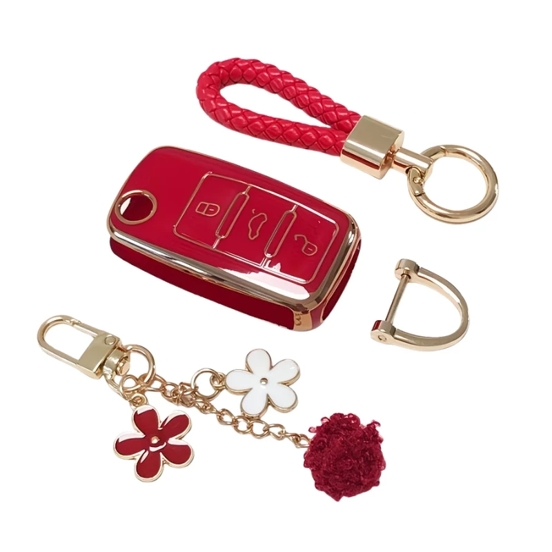 Emelje ki autókulcsát ezzel a vibráló piros védőtok készlettel. A dinamikus szín és az arany díszítés azonnal magára vonzza a tekintetet. A készlethez tartozó piros fonott pánt és a piros virágos függő tökéletes összhangot alkot, így ez a szett kiváló ajándékötlet is lehet. A védelem mellett a tok segít tisztán tartani a kulcsot, megvédve azt a portól és a zsíros ujjlenyomatoktól.
