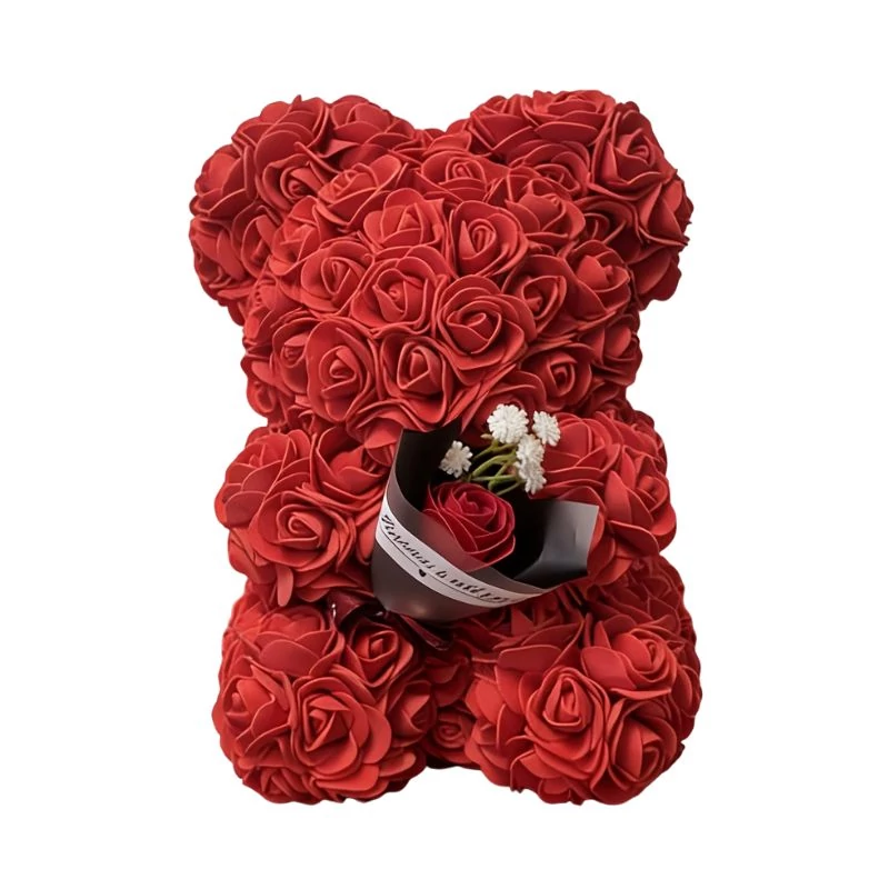 Ez a lenyűgöző vörös rózsa maci a tökéletes választás, ha valami igazán különlegeset és maradandót szeretne ajándékozni. A puha habrózsákból készült figura az örök szerelem és figyelem szimbóluma, amely sosem hervad el, így évekig a szoba dísze maradhat. A maci ölében egy elegáns, kisméretű virágcsokrot tart, amely még ünnepibbé teszi a megjelenését. Legyen szó Valentin-napról, évfordulóról vagy egy emlékezetes születésnapról, ez a kézzel készített hatású dekoráció garantáltan mosolyt csal a megajándékozott arcára.