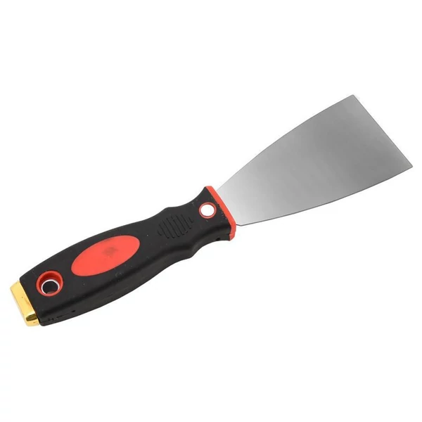 Csiszolt rozsdamentes acél ütésálló spatula (60 mm) ergonomikus nyéllel, amelyet két különböző keménységű, színes műanyag réteg borít a biztos fogás érdekében.