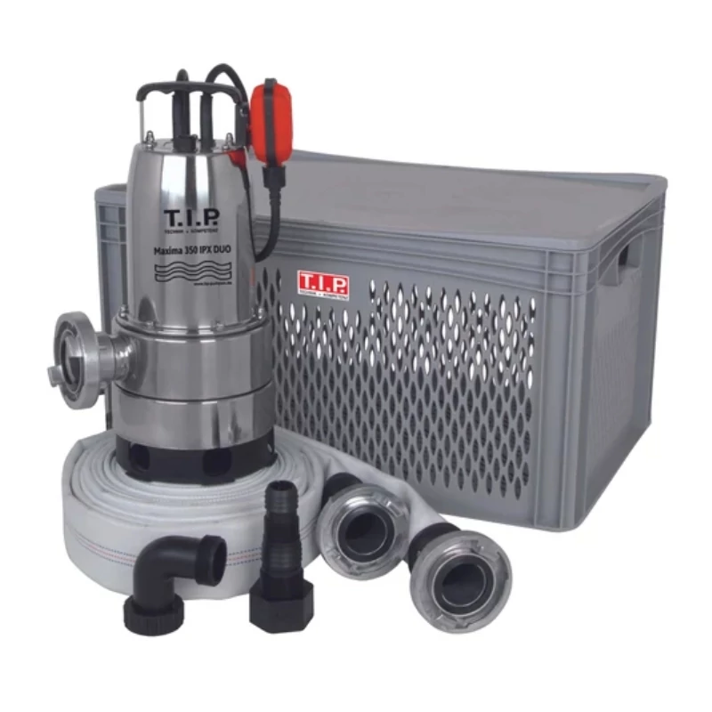 A szett tartalmaz egy Maxima 350 IPX DUO búvárszivattyút, egy praktikus szűrőkosarat és egy szakadásálló tűzoltótömlőt Storz csatlakozóval.